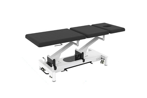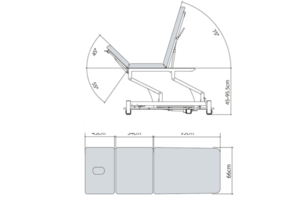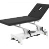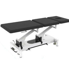 Camilla eléctrica de tres secciones con con perimetral para regular altura desde todos los costados de la base, en color gris, incorpora soporte de papel. 1 motor altura. Certificado CE