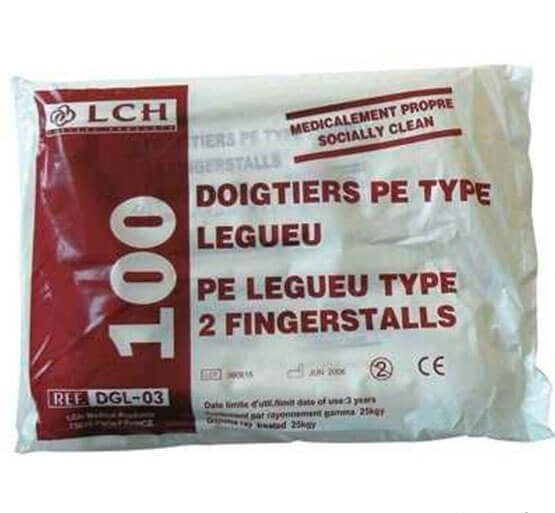 Caja de 100 guantes de dos dedos para exploración ginecológica tipo LEGUEU. Polietileno opaco. Sin látex.