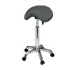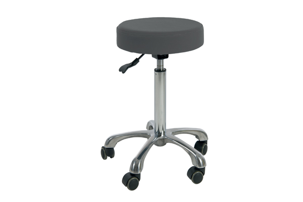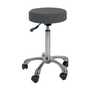 Práctico taburete de diseño ergonómico. Con asiento plano y circular con altura regulable mediante pistón de gas. Tapizado gris en PU de alta calidad y base cromada con 5 ruedas.