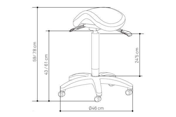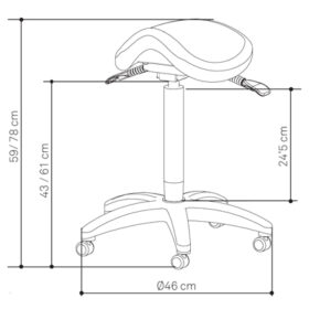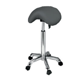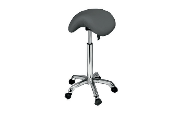 silla de montar. Altura regulable mediante pistón de gas. Tapizado gris en PU de alta calidad y base cromada con 5 ruedas.