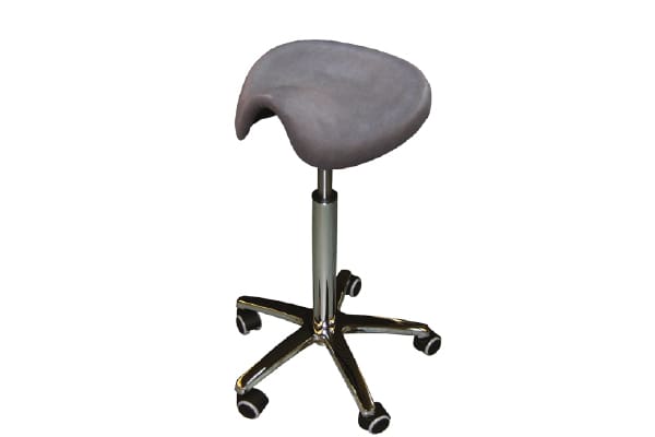 Altura regulable 42-55 cm. con resorte de gas. Estructura de acero cromado y asiento tapizado en gris. Y 5 ruedas dobles.